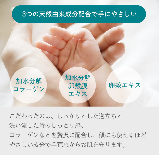 | 成分 | 精製水、グリセリン、ラウレス硫酸Na、ココイルグルタミン酸TEA、加水分解コラーゲン、 加水分解卵殻膜エキス、卵殻エキス、グリチルリチン酸2K、イソプロピルメチルフェノール、 フェノキシエタノール、香料 |