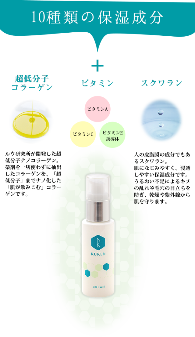 | 成分特性 | 10種の保湿成分+超低分子コラーゲン+ビタミンA、C、E成分 |