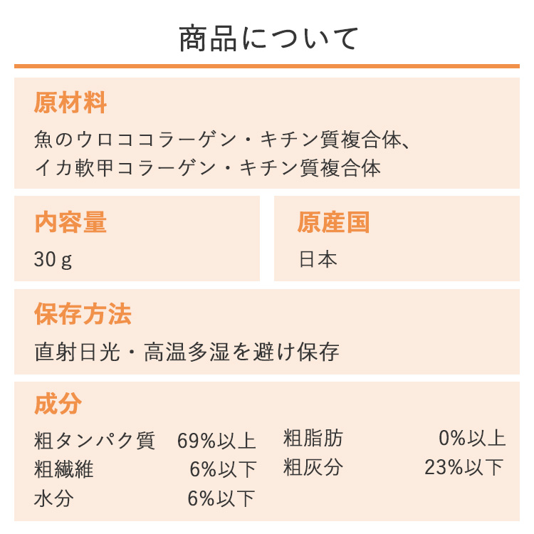 粗タンパク質:69%以上 粗脂肪:0%以上 粗繊維:6%以下